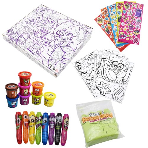 Kromě fixů sada obsahuje také voňavou modelínu v několika sytých barvách, která je netoxická a bezpečná pro děti. Modelína je balena v malých kelímcích s hravými obličeji, což dětem usnadňuje manipulaci a skladování. Součástí balení je i speciální voňavý kinetický písek, který je ideální pro tvorbu a hru na cestách. Díky své konzistenci se snadno tvaruje a zároveň se nedrobí, což minimalizuje nepořádek při hraní.