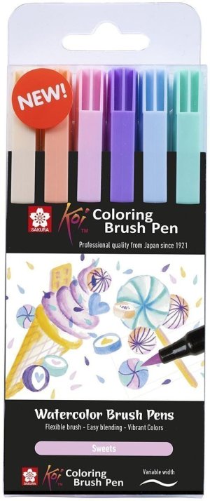 Zábavná sada se 6 barvami z bohaté palety barev Koi. Koi Coloring Brush Pens představují pohodlný způsob, jak přidat živé barvy do jakéhokoli náčrtu, deníku, kresleného vtipu, ilustrace nebo gumového razítka. Díky 48 transparentním barvám inkoustu se snadno mísí a vytváří množství odstínů a efektů. Koi Coloring Brush Pens mají pružný, robustní štětcový hrot, který umožňuje snadno kreslit různé tloušťky čar nastavením tlaku na hrot. Po použití se hrot štětce vrátí do původního tvaru. Inkoust je na vodní bázi, což umožňuje vytvářet krásné barevné přechody kreslením různých vrstev na sebe nebo přidržováním hrotů u sebe. Přidržením hrotů dvou štětcových per u sebe můžete snadno míchat barvy, protože inkoust stéká z jednoho hrotu do druhého. Inkoust lze také smíchat s vodou a získat tak akvarelové efekty.