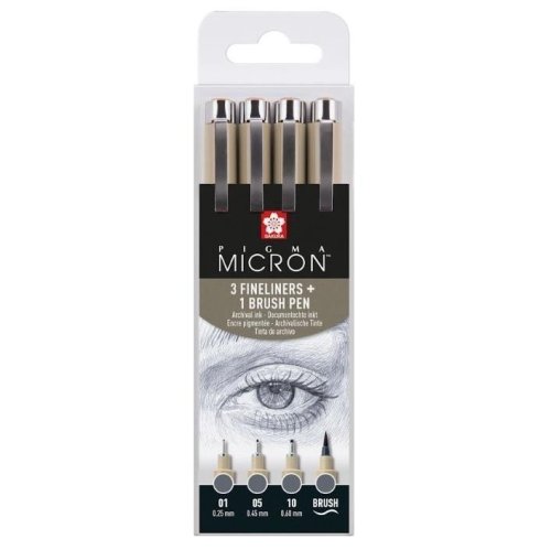 Výběr 4 chladně šedých per Pigma Micron a štětcových per: Pigma Micron 01 (0,25 mm), Pigma Micron 05 (0,45 mm), Pigma Micron 10 (0,60 mm) a Pigma Brush. S těmito stavitelnými šedými barvami můžete přidávat stínování, hloubku, vizuální akcenty a efekty vrstvení do ilustrací, kreseb, rozpisů bullet journalu a mnoho dalšího. Pigma Micron je první fineliner profesionální kvality na světě s pigmentovým inkoustem na vodní bázi. Inkoust Pigma rychle schne, je odolný proti vytékání a po zaschnutí je voděodolný. Vhodný pro všechny světlé povrchy papíru. Díky dlouhému kovovému hrotu je fineliner ideální pro použití s pravítky a šablonami.