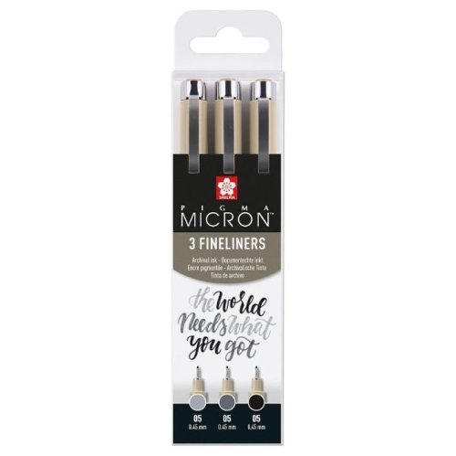 Výběr 3 ks fixů Pigma Micron 05 v barvách černá, studená šedá a světlá studená šedá (šířka linky: 0,45 mm). S těmito stavitelnými šedými linkami můžete přidávat stínování, hloubku, vizuální akcenty a efekty vrstvení do ilustrací, kreseb, rozpisů bullet journalu a mnoho dalšího. Pigma Micron je první fineliner profesionální kvality na světě s pigmentovým inkoustem na vodní bázi. Inkoust Pigma rychle schne, je odolný proti krvácení a po zaschnutí je voděodolný. Vhodný pro všechny světlé povrchy papíru. Díky dlouhému kovovému hrotu je fineliner ideální pro použití s pravítky a šablonami.
