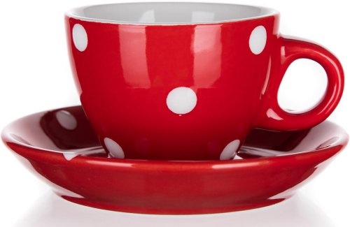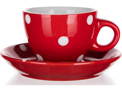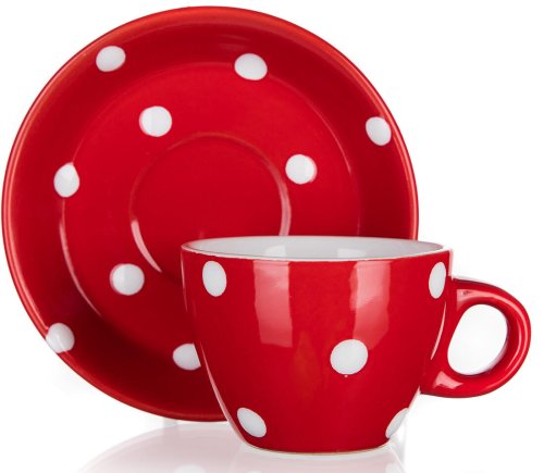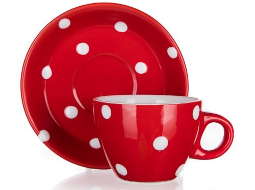 Šálek s podšálkem DOTS, červený s bílými puntíky, je vyrobený z kvalitní keramiky. Lze použít do mikrovlnné trouby i do myčky na běžné domácí použití.