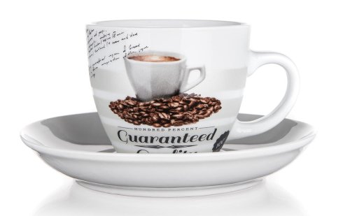 Šálek s podšálkem s dekorem GUARANTEED QUALITY, je vhodný na podávání kávy. Šálek s podšálkem lze použít do mikrovlnné trouby a mýt v myčce na nádobí, na šetrný program. UPOZORNĚNÍ: Použití myčky na šetrný program.
