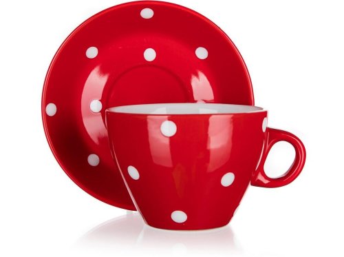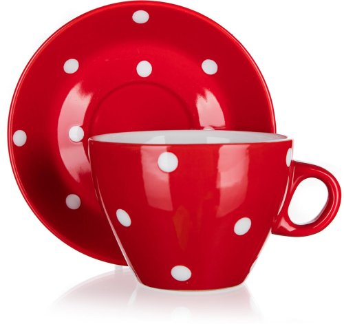Šálek s podšálkem DOTS, červený s bílými puntíky je vyrobený z kvalitní keramiky. Lze použít do mikrovlnné trouby i do myčky na běžné domácí použití.
