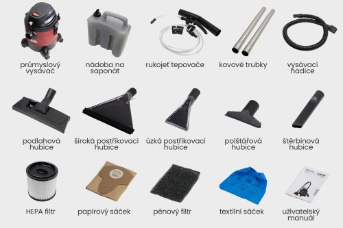 Tělo vysavače je vyrobeno pevného plastu, odolného proti nárazům a rzi. Masivní madlo a čtyři pojezdová kola zajistí snadnou manipulaci a stabilitu. Velký objem nádoby na odpad a odnímatelné nádoby na saponát zajistí úklid po dlouhou dobu. Dvě kovové trubky, vysávací hadice a dlouhá přívodní napájecí šňůra zajistí dostatečně velký akční rádius pro úklid vaší domácnosti.