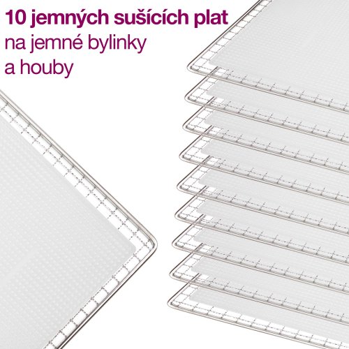 • 10 vložek na plata s jemným síťováním pro sušení jemnějších a lepkavých surovin (např. hub, bylinek, banánů, rajčat atp.)