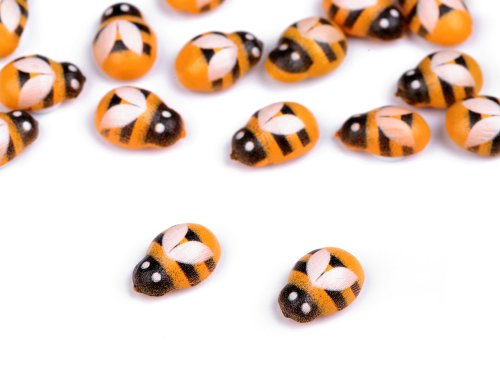 Dřevěné včelky mají na spodní straně samolepicí pěnovou tečku. Jsou vhodné k ozdobení alb, pozvánek, krabiček, věnců, květináčů i samotných květin, kam je můžete nalepit třeba na listy.