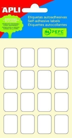 Samolepící etikety, obdélníkový tvar. Rozměr 16 x 22 mm. Permanentní. Malé balení v blistru, 96 ks, 6 listů.