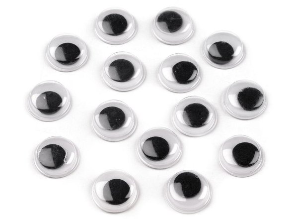 Plastové oči dodají obličejům lidí nebo zvířat veselý pohled a budou tou správnou tečkou vašeho dekorativního snažení. Černá čočka je pohyblivá. Spodní strana je opatřená samolepicí fólií. Nalepení očí je snadné. Odlepte spodní krycí papír a oči přilepte na suchý, čistý, pevný povrch. Široké uplatnění najdou při tvorbě originálních přání technikou scrapbooking.