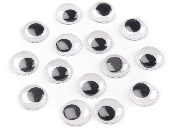 Plastové oči dotáhnou postavy lidí nebo zvířat do konce. Záleží jen na vaší fantazii, kam je nalepíte. Černá čočka je pohyblivá. Spodní strana je opatřená samolepicí fólií. Nalepení očí je snadné. Odlepte spodní krycí papír a oči přilepte na suchý, čistý, pevný povrch. Široké uplatnění najdou při tvorbě originálních přání technikou scrapbooking.