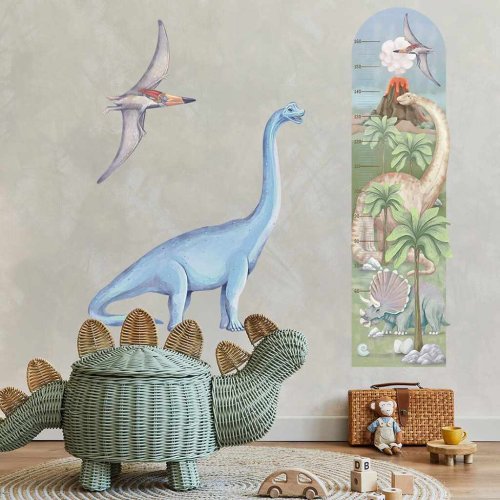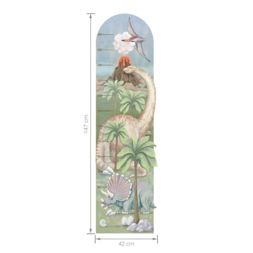 Krásná nálepka na zeď Dino - výšková míra. Označování výšky dětí v každé další etapě jejich života je tradice, která se pěstuje po generace. Nabízíme vám jedinečné výškové míry ve formě samolepek, které lze nalepit kamkoli a zaznamenat každý další centimetr výšky vašeho dítěte. Výběrem dinosaurů na výšku a přidáním dalších samolepek na zeď vytvoříte pro své dítě jedinečný pokoj. Samolepka je zajištěna speciálním matným laminátem, který ji chrání před poškrábáním při každodenním používání a zároveň usnadňuje lepení – fólie je silnější a snáze se přenáší na zeď. Pokud hledáte dokonalý způsob, jak oživit dětský pokojíček, naše samolepky na zeď jsou tou správnou volbou. Objednejte si je ještě dnes a udělejte radost svému dítěti. Na míru si můžete poznamenat výšku od 50 do 160 cm. Rozměr samolepky: 42x147 cm. Přesné rozměry každé části nálepky jsou uvedeny na poslední fotografii.
