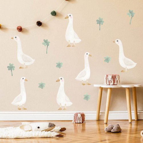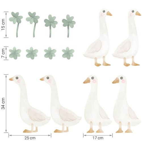 Krásná nálepka na zeď Husičky. Nálepky na zeď s husičkami vyzařují jemnost svými neutrálními tóny a jedinečnými detaily a hladce zapadají do atmosféry interiérů inspirovaných boho. Jejich jemnost z nich dělá nádhernou dekoraci vhodnou pro chlapce i dívky. Pozvedněte kouzlo a radost v jejich pokojích s našimi úchvatnými samolepkami na zeď. Nálepka je krásnou dekorací, zároveň chrání zeď před nečistotami nebo poškozením. Samolepka je zajištěna speciálním matným laminátem, který ji chrání před poškrábáním při každodenním používání a zároveň usnadňuje lepení – fólie je silnější a snáze se přenáší na zeď. Pokud hledáte dokonalý způsob, jak oživit dětský pokojíček, naše samolepky na zeď jsou tou správnou volbou. Objednejte si je ještě dnes a udělejte radost svému dítěti.<BR>Tato sada obsahuje: <BR> samolepky na zeď husy (6 ks) a jetel (8 ks). Přesné rozměry každé části nálepky jsou uvedeny na poslední fotografii.