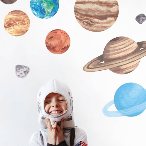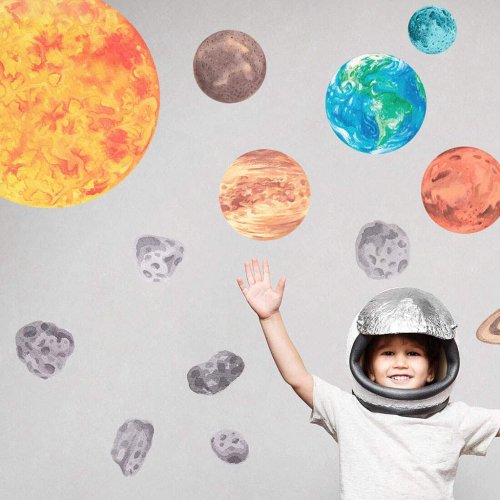 Krásná nálepka na zeď Sluneční soustava S. Samolepky sluneční soustavy jsou skvělým způsobem, jak přidat do dětského pokoje nadpozemský vesmírný motiv. Sada samolepek obsahuje 8 planet: Merkur, Venuše, Země, Mars, Jupiter, Saturn, Uran a Neptun. Sada také obsahuje slunce, měsíc a několik asteroidů.<BR>Samolepka je zajištěna speciálním matným laminátem, který ji chrání před poškrábáním při každodenním používání a zároveň usnadňuje lepení – fólie je silnější a snáze se přenáší na zeď. <BR>Objednejte si je ještě dnes a udělejte radost svému dítěti. Přesné rozměry každé části nálepky jsou uvedeny na poslední fotografii.<BR>Upozornění: Nedoporučujeme aplikovat naše samolepky na stěny natřené latexovými, hladkými nebo voskovými barvami.<BR>- rozměry: zobrazeno na poslední fotografii<BR>- materiál: nejkvalitnější PVC fólie<BR>- ochrana: odolná proti poškrábání matný laminát<BR>- odolný: fólie odolná vlhkosti a UV záření<BR>- vyříznutá: mimo obrys - nemají podklad<BR>-balení: baleno v eko tubách