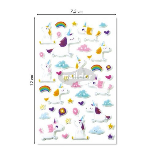 Samolepky Maildor 3D Cooky s motivy jednorožců a s efektem 3D. Balení obsahuje 1 arch s 40 samolepkami. Rozměr balení 7,5 x 12 cm.