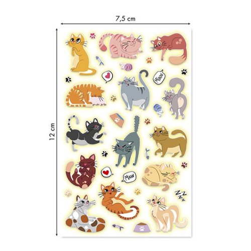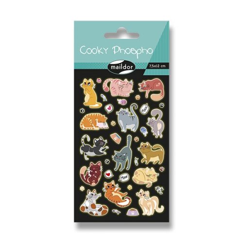 Samolepky Maildor 3D Cooky Phospho s 3D efektem jsou fosforeskující ve tmě s motivy kočiček. Balení obsahuje 1 arch s 36 samolepkami,,Rozměry balení: 7,5 x 12 cm.