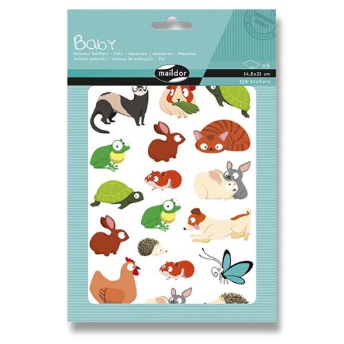 Samolepky Maildor Baby velké velikosti pro snadnou manipulaci s dětskými motivy domácích zvířátek. Balení obsahuje 6 listů, 2 motivy po 3 ks. Samolepky lze sloupnout a znovu nalepit,Vhodné pro děti již od 2 let. Rozměry balení: 14,8 x 21 cm.