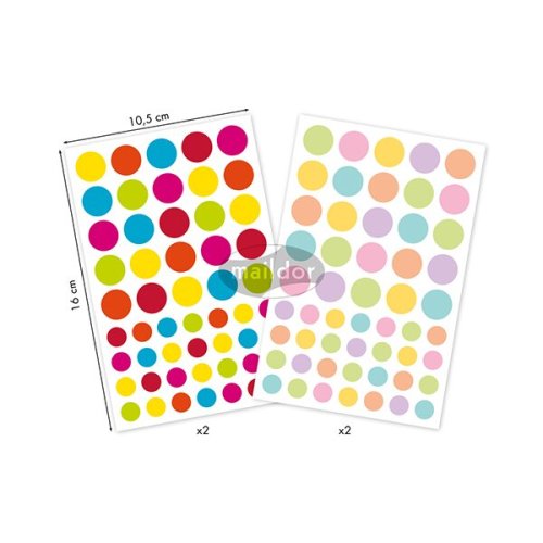 Samolepky Maildor Inital s různými barvami a velikostmi koleček. Balení obsahuje 4 listy, 2 motivy po 2 ks. Samolepky lze sloupnout a znovu nalepit. Rozměry balení: 10,5 x 16 cm.