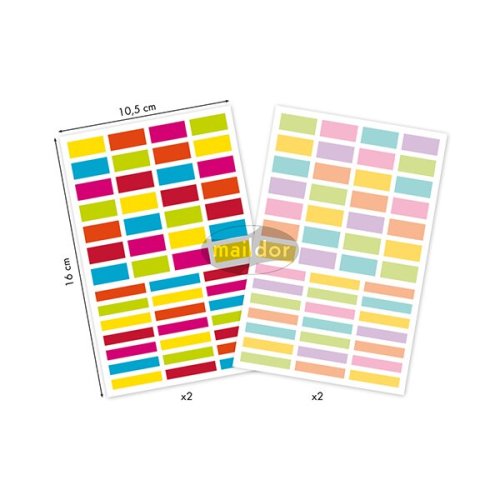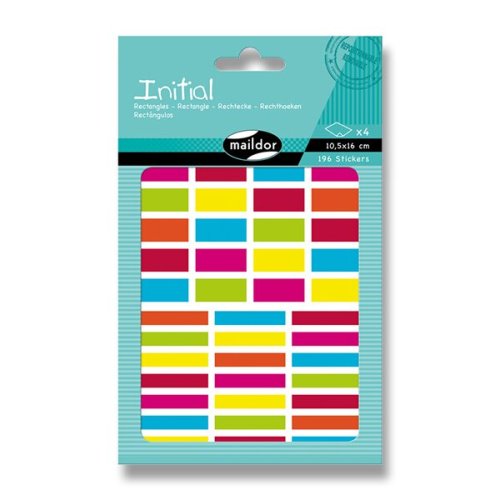 Samolepky Maildor Inital s různými barvami a velikostmi obdélníků. Balení obsahuje 4 listy, 2 motivy po 2 ks. Samolepky lze sloupnout a znovu nalepit. Rozměry balení: 10,5 x 16 cm.