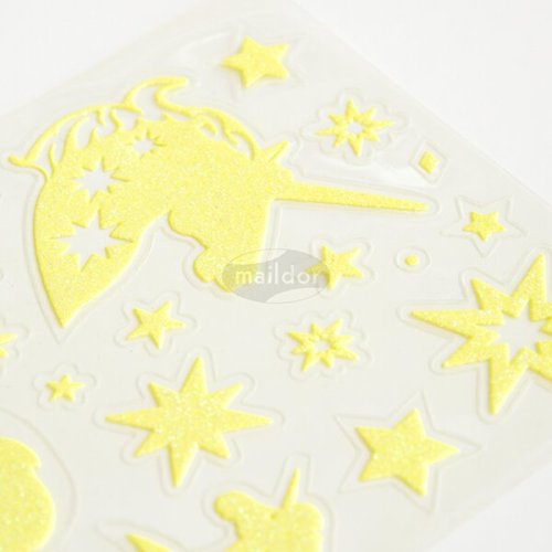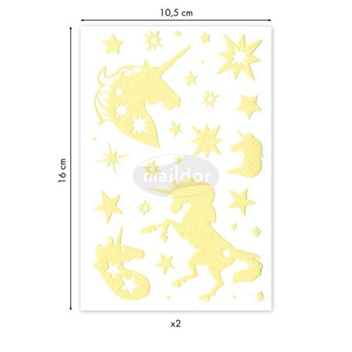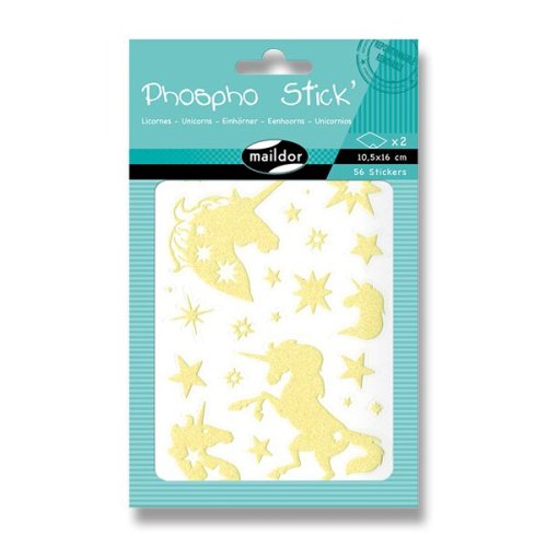 Samolepky Maildor Initial Phospho s motivy jednorožců v třpytivém a ve tmě fosforeskujícím provedení. Balení obsahuje 2 listy, 2 motivy po 1 ks. Samolepky lze sloupnout a znovu nalepit. Rozměry balení: 10,5 x 16 cm.