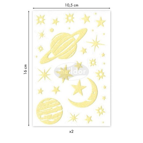 Samolepky Maildor Initial Phospho s motivy planetek v třpytivém a ve tmě fosforeskujícím provedení. Balení obsahuje 2 listy, 2 motivy po 1 ks. Samolepky lze sloupnout a znovu nalepit. Rozměry balení: 10,5 x 16 cm.