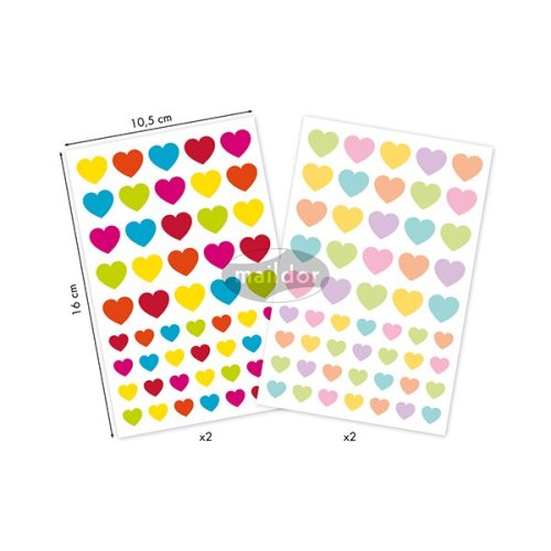 Samolepky Maildor Inital s různými barvami a velikostmi srdcí. Balení obsahuje 4 listy, 2 motivy po 2 ks. Samolepky lze sloupnout a znovu nalepit. Rozměry balení: 10,5 x 16 cm.