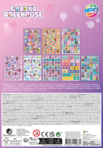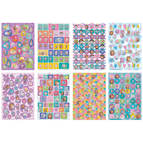 Třpytivé samolepky s motivem postaviček z pohádky Gábinin kouzelný domek. V sešitu 8 archů. Rozměry 15x21 cm. Věk 3+