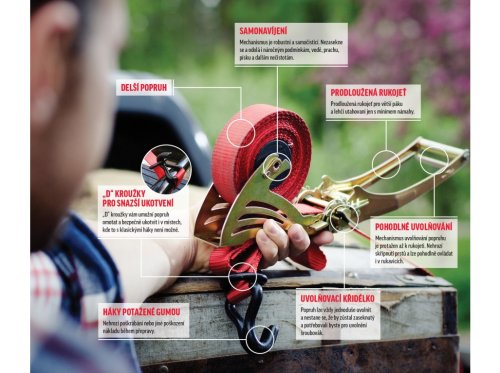 Robustní háky s gumovým potahem pomáhají ochránit náklad před poškozením, zatímco univerzální „D“ kroužky rozšiřují možnosti uchycení – oceníte je zejména tam, kde klasické háčky nelze použít. Všechny kovové části jsou ošetřeny opískovaným povrchem, který zvyšuje odolnost vůči opotřebení i korozi – zaručuje tak dlouhou životnost i při častém používání.