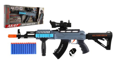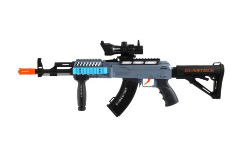 Realistický samopal se zajisté bude líbit všem klukům, kteří mají rádi zbraně. Samopal je na baterie se světlem a zvukem a v balení je i 12 pěnových nábojů, nemusíte se tak bát, že by se děti mohli zranit nebo něco rozbít. Samopal je na baterie, 3x AA, jsou součástí balení. Velikost pistole: 60 cm Rozměr balení: 65 x 27 x 6 cm Vhodné pro děti od 3 let