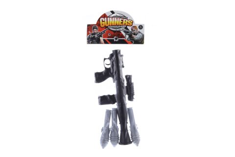 Plastový raketomet. Sada obsahuje 3 rakety. Pomocí tlaku se raketa vsune do zbraně a zmačknutím spouště vystřelí. Baleno v sáčku. Rozměry balení 40x17x4 cm. Věk 3+