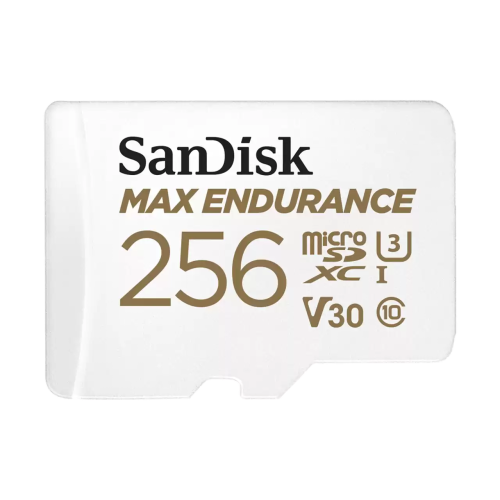 Paměťová karta microSD 256 GB SanDisk MAX ENDURANCE dokáže zachytit až 120 000 hodin záznamu z domácích bezpečnostních kamer či autokamer. Je navržena pro nepřetržitý záznam a přepisování záznamů. SD adaptér v balení.