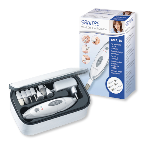 Manikúra / pedikúra Sanitas SMA 35 Sada na manikúru / pedikúru 2 rychlosti Chod doleva i doprava Rychlost 3800 + 4600 ot./min 7 safírových nástavců Pouzdro Síťové napájení Safírový disk, tenký Jemná …