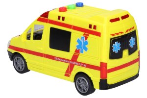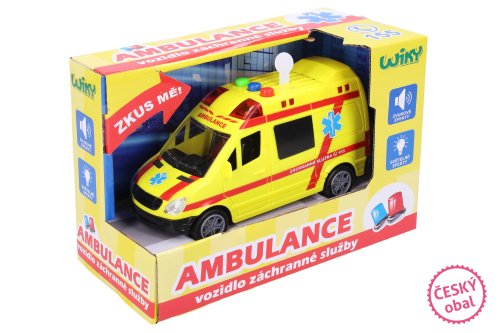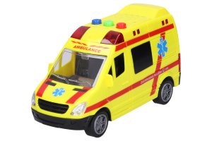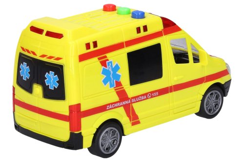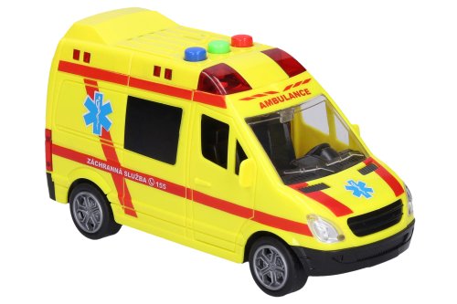 Sanitka, délka 14,5 cm. Světelné a zvukové efekty, aktivace tlačítky. 3xAG13 baterie součástí. Pohon na setrvačník.