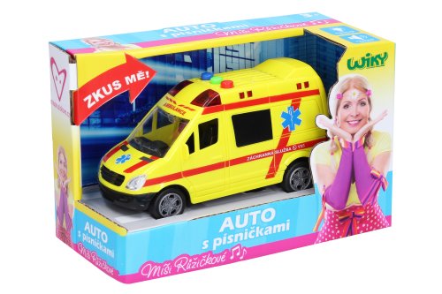 Sanitka - Míša Růžičková. Velikost 14,5 cm. Na setrvačník. Světelné a zvukové efekty, tlačítky na střeše auta 3 písníčky Míši Růžičkové - Sanitka, Policejní, Popeláři. 3xAG13 baterie součástí.