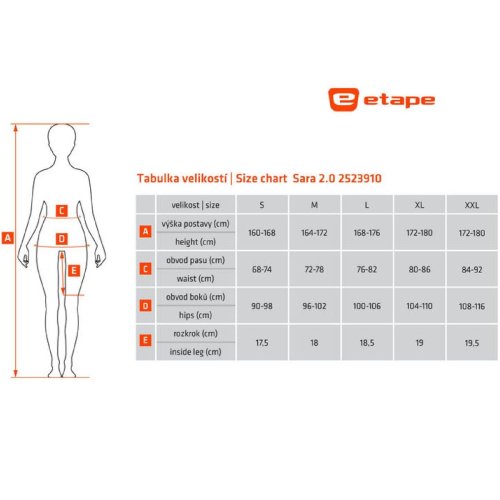 Elastické dámské šortky ETAPE Sara 2.0 ocení každá cyklistka, ať už na kole jezdí pravidelně či rekreačně. Tyto cyklistické krátké kalhoty jsou vyrobené z materiálu Fibra Pro™ - materiál s vynikající kompresní funkcí pro ještě lepší sportovní výkony. Dokonale se přizpůsobí tělu a nebrání pohybu. Vložka Stretch - ve všech směrech pružná a bezešvá cyklistická vložka se díky proměnné tloušťce a prolisům výborně anatomicky přizpůsobí tělu cyklistky. Její vrchní antibakteriální vrstva má vynikající transpirační vlastnosti. - materiál Fibra ProTM - tvarovaný elastický pas - protiskluzové silikonové zakončení nohavic - reflexní bezpečnostní prvky - dámská elastická vložka Stretch Woman Velikostní tabulka v obrázcích. Uvedené hodnoty jsou pouze orientační a vhodná velikost se může lišit dle konkrétního typu postavy.