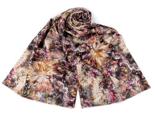 Šála s abstraktními motivy je měkká, hustě tkaná, vyrobená z materiálu příjemného na dotek. Na koncích je zakončená krátkými třásněmi. Využijete ji do společnosti i na všední nošení ke kabátu, saku, halence, svetříku, šatům apod. Příjemně zahřeje, je vhodná do chladnějšího jarního a podzimního počasí. Některé šály mají špatné štítky, skutečné složení je 100% polyester.