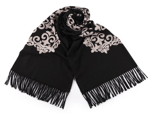 Velká vlněná šála s ornamentální výšivkou je velice kvalitní, komfortně vás zahřeje v sychravých dnech. Je vyrobená z materiálu příjemně hebkého na dotek. Na koncích je zakončená dlouhými třásněmi. Můžete ji nosit do práce i do společnosti, výšivka má jemný lesk, elegantní dozdobí váš outfit. Upozorňujeme zákazníky, že složení na štítcích se může lišit, materiál je vlna, polyester a viskóza.
