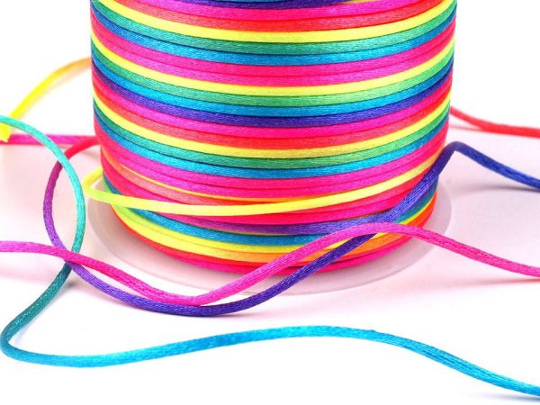 Saténová šňůra působí díky svému duhovému zabarvení vesele a hravě. Přechody mezi barvami jsou plynulé. Šňůra je kvalitní a pevná. Použití: Ze šňůry můžete vyrábět náramky, náhrdelníky, čelenky nebo opasky pomocí techniky kumihimo a scoubi nebo ji jen použít jako návlekový materiál na větší korálky. Využijete ji i k balení dárků, je měkká a snadno se zavazuje. Dodá barevný akcent vašemu outfitu, protože má jasné a výrazné barvy. Šňůra se sama postará o barevné duhové efekty.