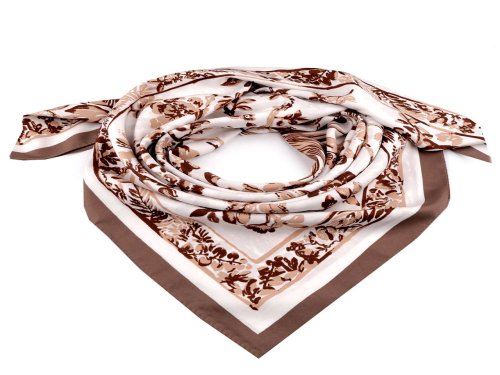 Velký saténový šátek s motivem větviček a květů využijete na každodenní nošení. Je lehounký a měkký, doslova vás bude hýčkat, protože na dotek připomíná hedvábí. Šátek můžete uvázat do slušivého uzlu, který podtrhne eleganci vašeho oděvu. Šátek je jednostranný. Některé šátky mají špatné štítky, skutečné složení je polyester. Omlouváme se za toto nedopatření a děkujeme za pochopení.