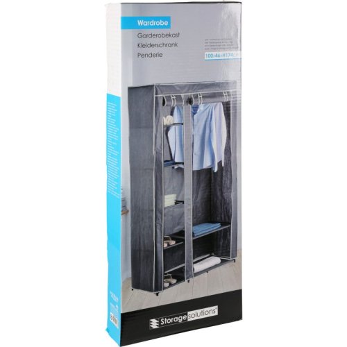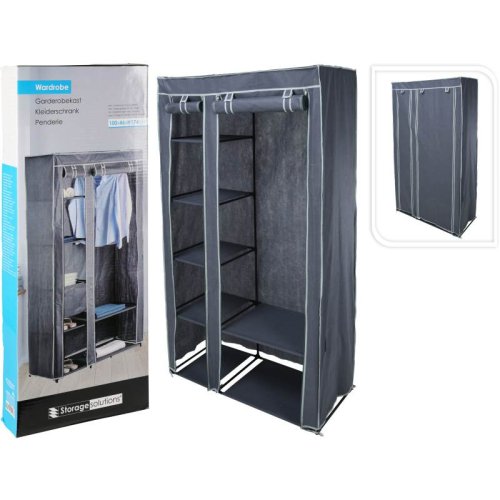 šatní skříň s 1 ocelovou tyčí na šaty a 5 policemi, rozměr 100x46xh174cm. hmotnost: 2300 g, netkaný potah se spojovacími tyčemi z pp a ocelovými trubkami (průměr 13 mm). lemování a zip ve světle šedé a zbytek v tmavě šedé barvě.