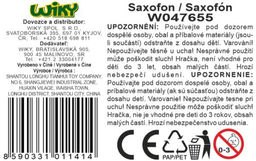 Saxofon. Velikost 27 cm. 2 varianty - modrá, růžová. Přesné rozměry 10x6x27 cm.