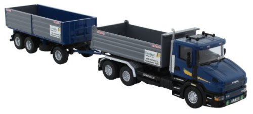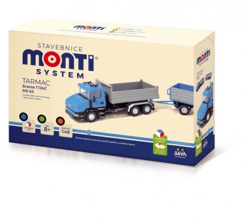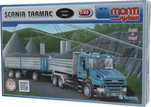 Model Scania MS 65 Tarmac s návěsem v měřítku 1:48. Obě korby jdou vyklápět, stejně tak i kapota motoru. Stavebnice patří do skupiny Profi.