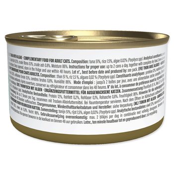 | Složení: | Tuňák (51 %), rýže (1,5 %), řasy [Porphyra spp] (0,02 %). |