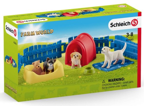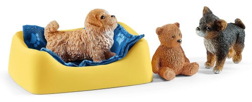 Balení obsahuje: boudu, pelíšek, plot, tři figurky štěňat a doplňky. V pokoji pro štěňata si spolu hrají maltipoo, čivava a labradorský retrívr. Co jsou ti tři schopni spolu natropit za rozpustilý nepořádek! Hrají si na měkké dece, přetahují se o plyšového medvěda a hrají si na schovávanou. Občas si zaslouženě schrupnou v psím pelíšku.