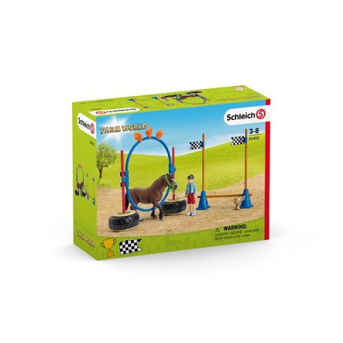 Balení obsahuje: velšského pony, figurku chlapce, jezdeckou helmu, uzdu, vodicí lano, pohár, překážky, 2 vlajky start-cíl, arch nálepek