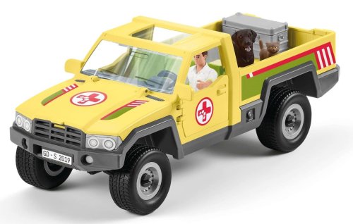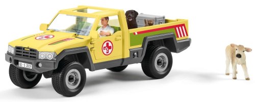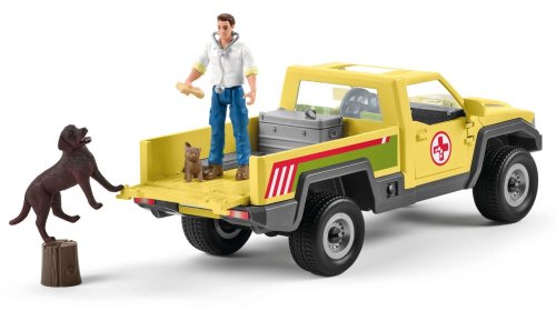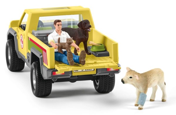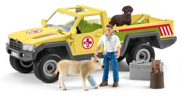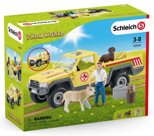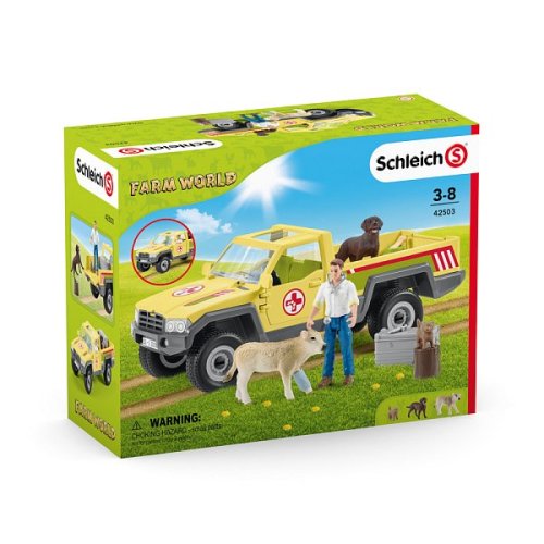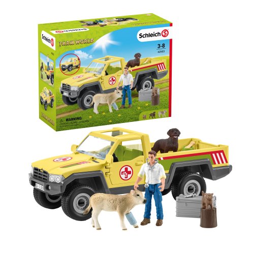 Jedinečné figurky, které jsou jako živé! Figurky a doplňky Schleich Farm World jsou propracovány do posledního detailu. Pronikni do světa zvířat, nasbírej figurky a objev tak zvířata naší planety. Balení obsahuje: 1x terénní auto, 1x veterinář, 1x tele, 1x labradorský retrívr, 1x kotě, 1x lékařský box, 1x stetoskop, 1x obvaz, 1x miska, 1x kost, 1x kmen stromu, 1x nálepka Tele na farmě si vymklo nohu. Veterinář okamžitě skočí do svého záchranného terénního auta a se svým labradorem a kočkou se vydá vyšetřit zraněné tele. Box s léky a obvazy je vždy na korbě terénního auta připraven k použití. Veterinář okamžitě obvazuje nohu telete a veze ho do veterinární ordinace. Po rentgenu se tam může zotavit, než se vrátí zpět na farmu. Veterinář má pohyblivé ruce a nohy. Dveře auta lze otevírat a zavírat. Schleich jsou realistické a do detailů propracované figurky, kde se designeři soustředili na filozofii těla, strukturu svalů a celkový výraz postavičky. Děti si tak mohou hrát se zvířátky z celého světa, pravěkými dinosaury, filmovými a pohádkovými postavičkami, které jsou věrnou kopií svých předloh, a kouzelnými elfy a vílami z magického světa Bayala. Vhodné pro děti od 3 let.