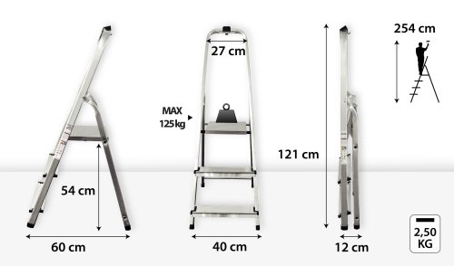 Výška schůdků: 1,21 m Pracovní výška: 2,54 m Výška podesty: 0,54 m Šířka: 0,4 m Nosnost: 125 kg Materiál: hliník/plast Hmotnost: 2,5 kg Transportní rozměr: 121x40x12 cm