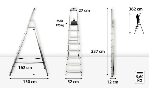 Výška schůdků: 2,37 m Pracovní výška: 3,62 m Výška podesty: 1,62 m Šířka: 0,52 m Nosnost: 125 kg Materiál: hliník/plast Hmotnost: 5,6 kg Přepravní rozměry: 237x52x12 cm