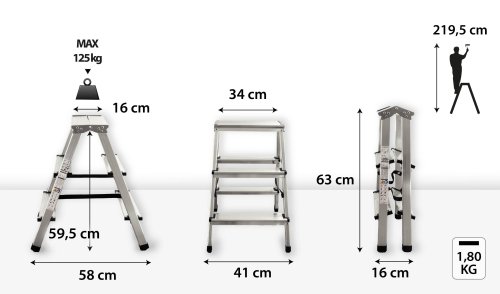 Výška schůdků: 0,63 m Pracovní výška: 2,2 m Výška podesty: 0,60 m Šířka: 0,41 m Nosnost: 125 kg Materiál: hliník Hmotnost: 1,8 kg