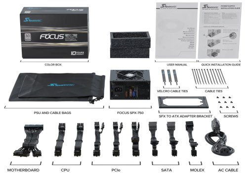 Napájecí zdroj s výkonem 750 W nabízí tichý chod, aktivní PFC a 92 mm velký ventilátor s FDB ložiskem. Modulární kabeláž a kompaktní SFX provedení ušetří cenné místo ve skříni. Účinnost zdroje je 80PLUS Platinum.