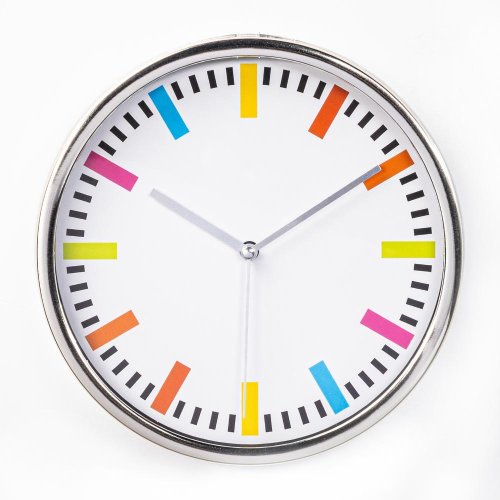 Nástěnné hodiny Napájení z baterie Rozměry 200 MM Pouzdro ve tvaru kruhu Plastové pouzdro Stříbrná barva pouzdra Ručičkový ciferník Bílá barva ciferníku Ciferník s dvanácti indexy