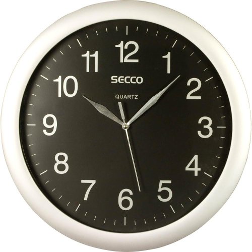 Nástěnné hodiny Napájení z baterie Rozměry 320 MM Pouzdro ve tvaru kruhu Plastové pouzdro Stříbrná barva pouzdra Ručičkový ciferník Černá barva ciferníku Ciferník s arabskými čísly